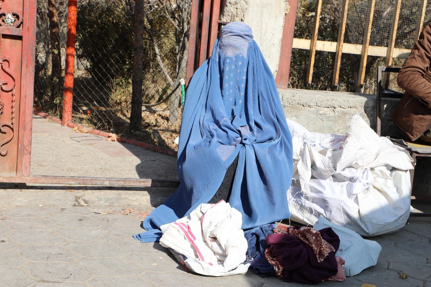The red polka-dot dress is hers, the white suit is her husband’s and the white track suit with black lines belongs to one of her sons. She has laid out her belongings on a walkway in one of Kabul’s busiest markets as she waits patiently for customers. The woman is covered in a burqa because she doesn’t want her relatives to see her selling her belongings.