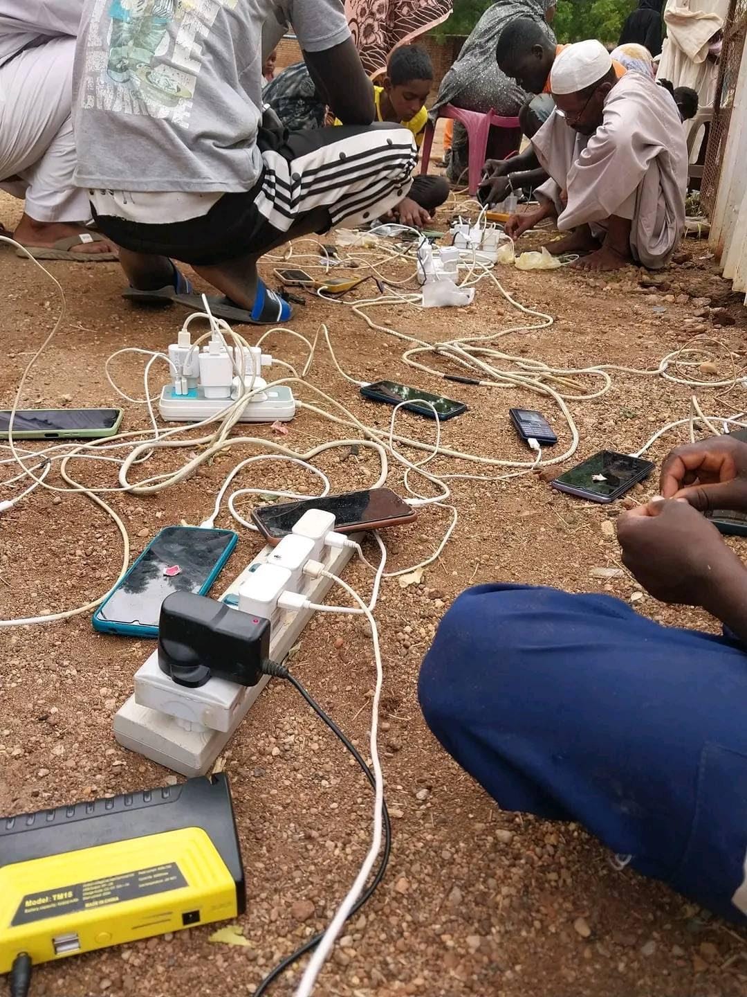 SENNAR, SUDAN–Dozens of men gather in back alleys or outside bakeries, anxiously waiting their turn to recharge their phones, a crucial lifeline now that Sennar is surrounded by the Rapid Support Forces. The men huddle around powerstrips surrounded by tangles of phone charging cords, each taking his turn. Electricity has become so scarce that the bakeries now permit each individual less than thirty minutes to charge his device.