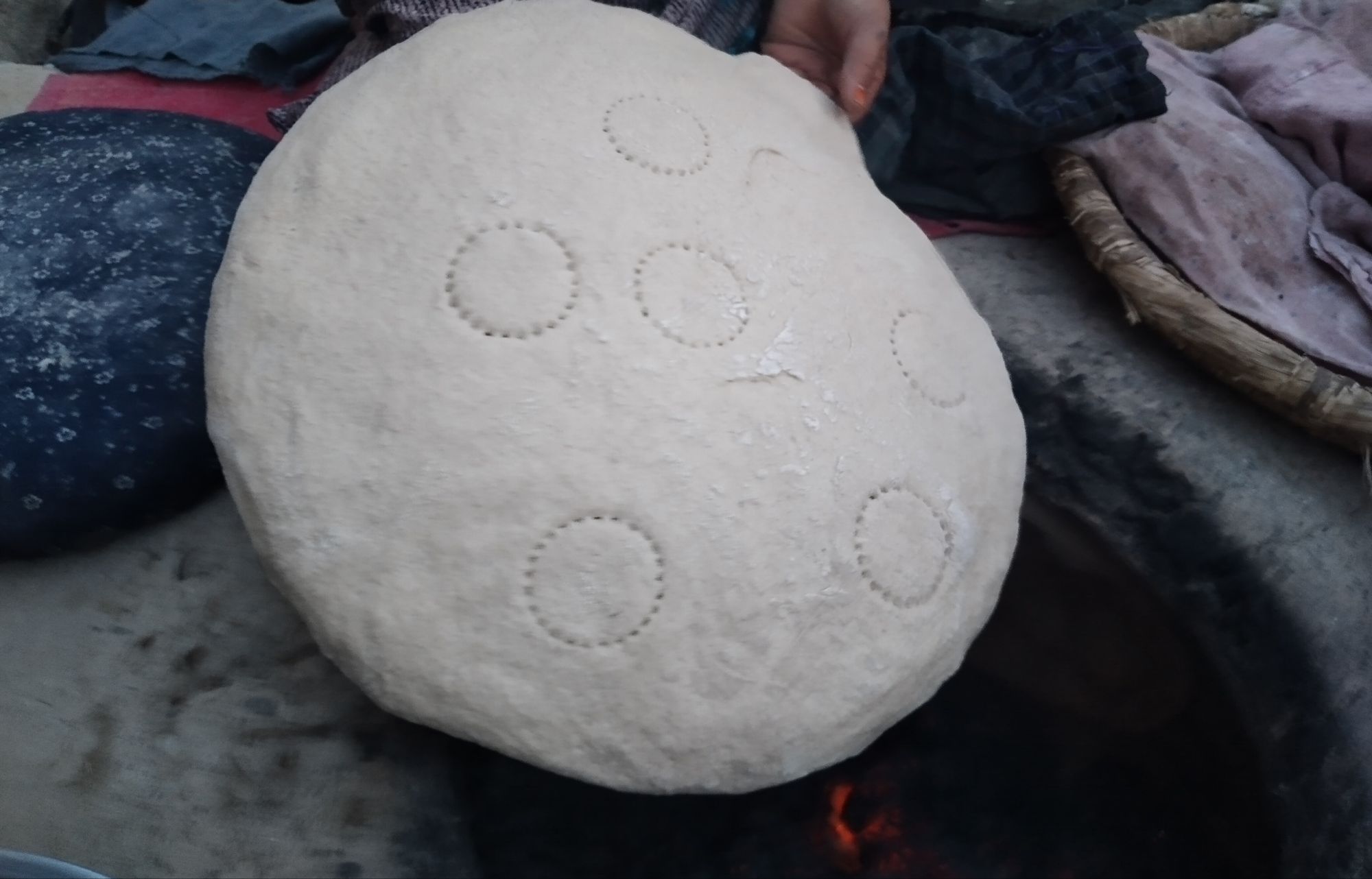 The dough is ready to be baked around 3 in the afternoon. Karima takes the dough to the tandoor oven, located in one corner of the house. She first heats the tandoor with dry wood, then chooses a place for herself around the tandoor, and rolls up her sleeves to start baking the bread.