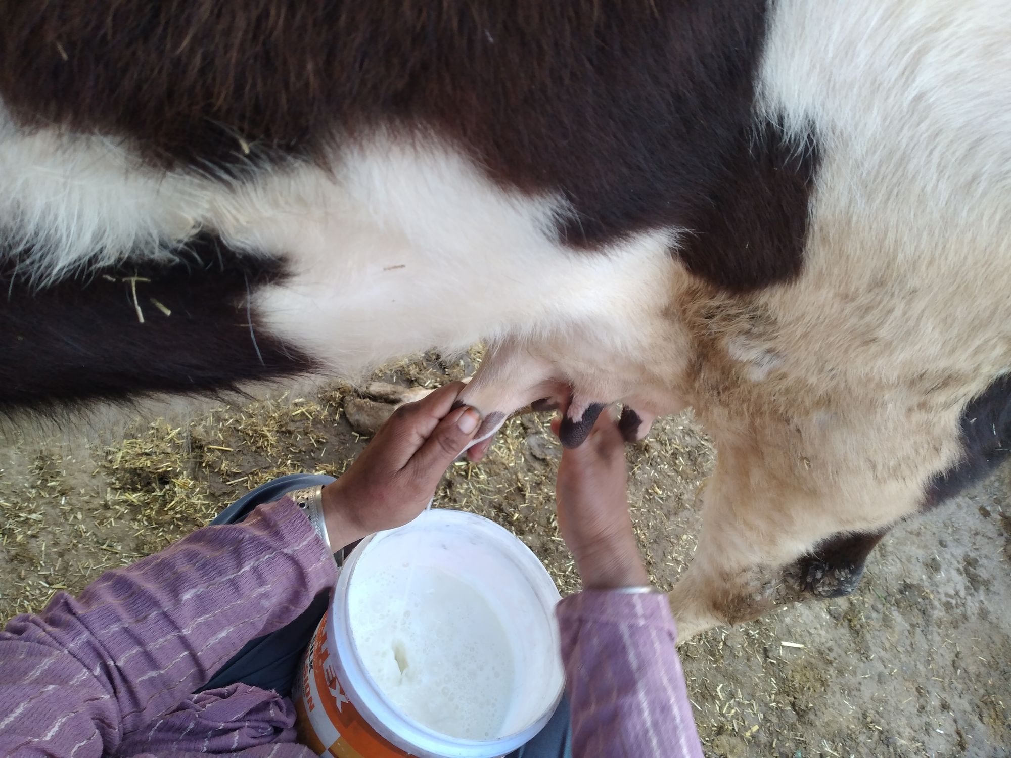 It’s now 12 pm, after finishing the laundry, Karima goes to the stable again to milk the cows. She again provides some fodder before she milks them. It takes around 45 minutes for her to finish milking the cows. The result is two full buckets of fresh milk containing about five liters in each. Karima takes the milk inside her home, removes her work clothes and prepares for lunch.