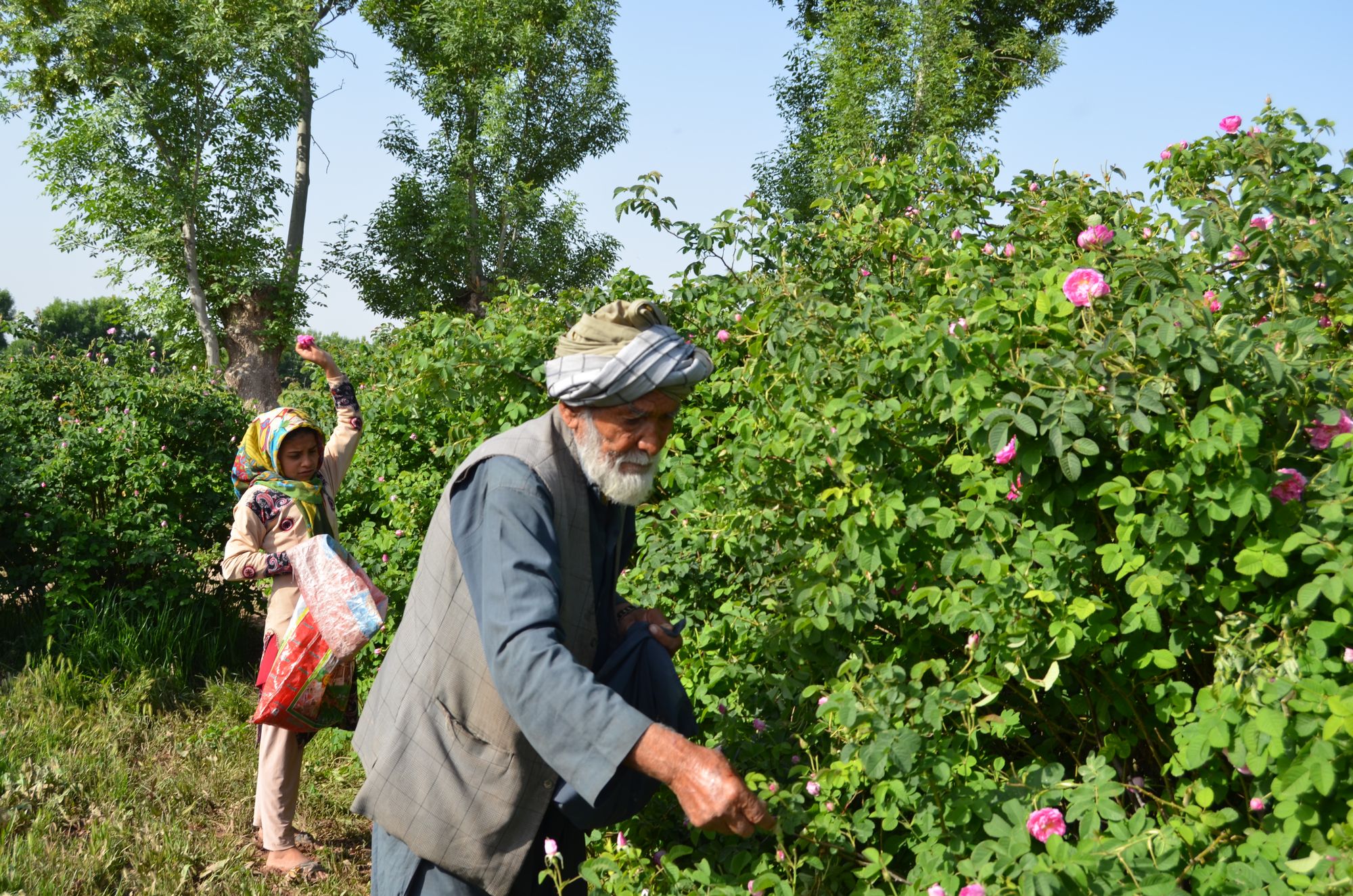 A group of women and an old man are busy picking flowers, Mr. Attaran says that they receive between 150 to 200 Afghanis ($1.70 to $2.27) per day for picking roses on the farm.