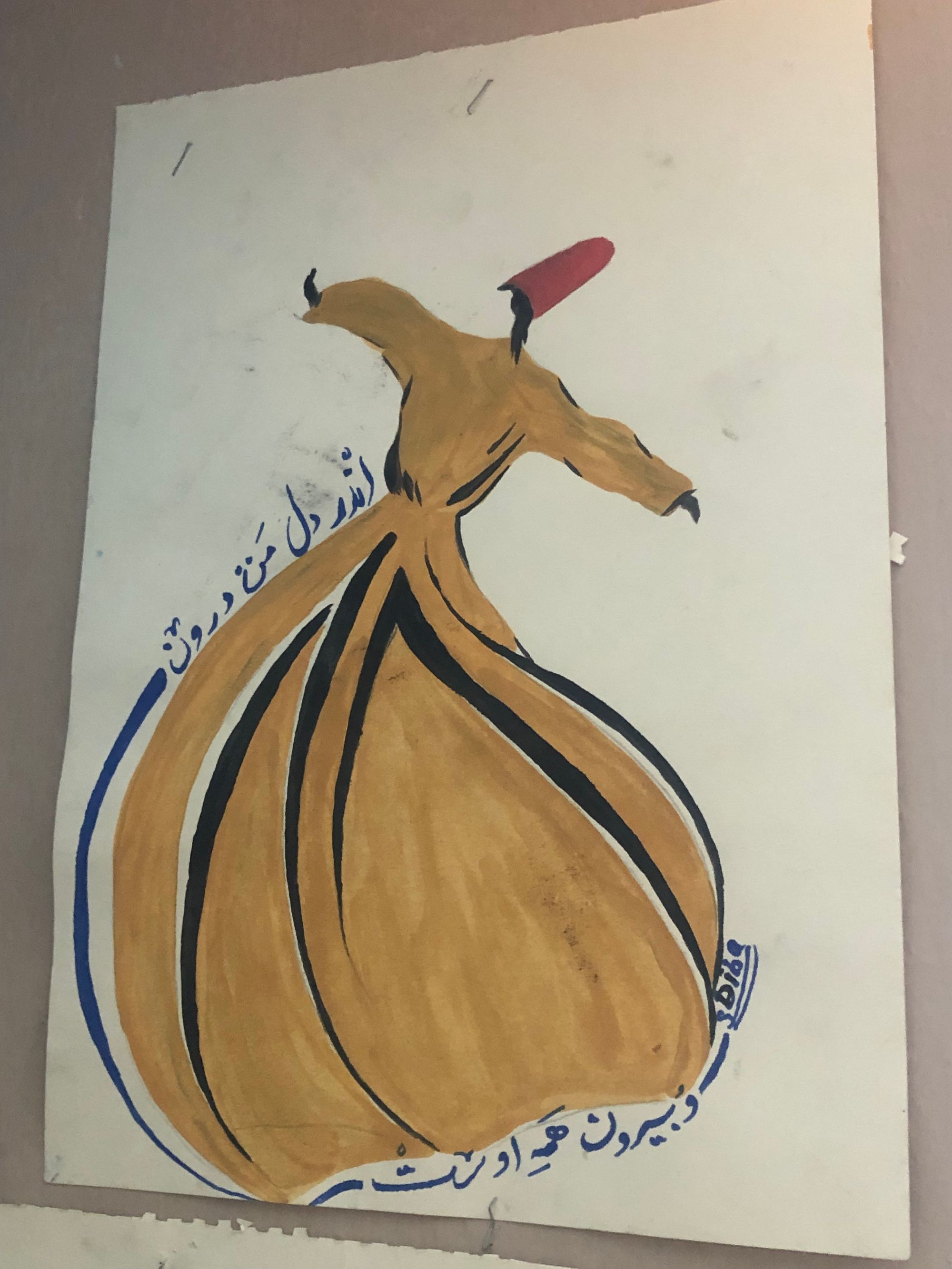 The most tragic event in Diba’s life was the death of her father. Diba fears that the responsibility to provide for her family will her from painting and drawing. Some of her paintings are a mix of painting and poetry together, which includes poems from Rumi and the whirling dervishes. One portrait is of Nasir- Khesraw Balkhi, an 11th-century poet from Balkh, a province in today’s northern Afghanistan.