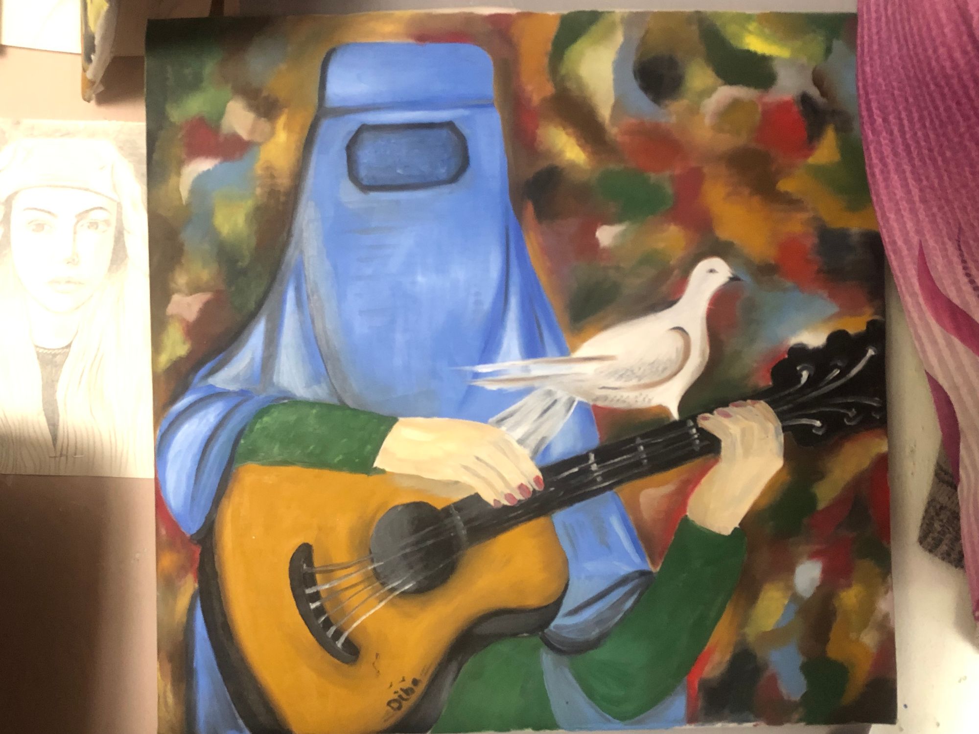 Diba points towards a painting on the wall of her studio and says, “This was my first painting, which I completed last spring.” The painting depicts an Afghan woman in a burqa, with half of her face exposed and some of her hair visible, symbolizing freedom and captivity.