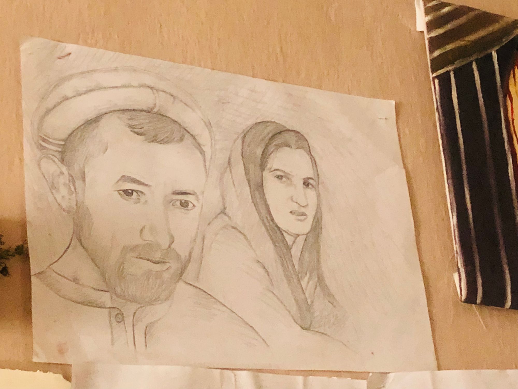 It is now 2 pm. A drawing of a man and a woman in the highest row to my left catches my attention. Diba sighs and says, “That’s my parents, I drew this in the early days of my work.”