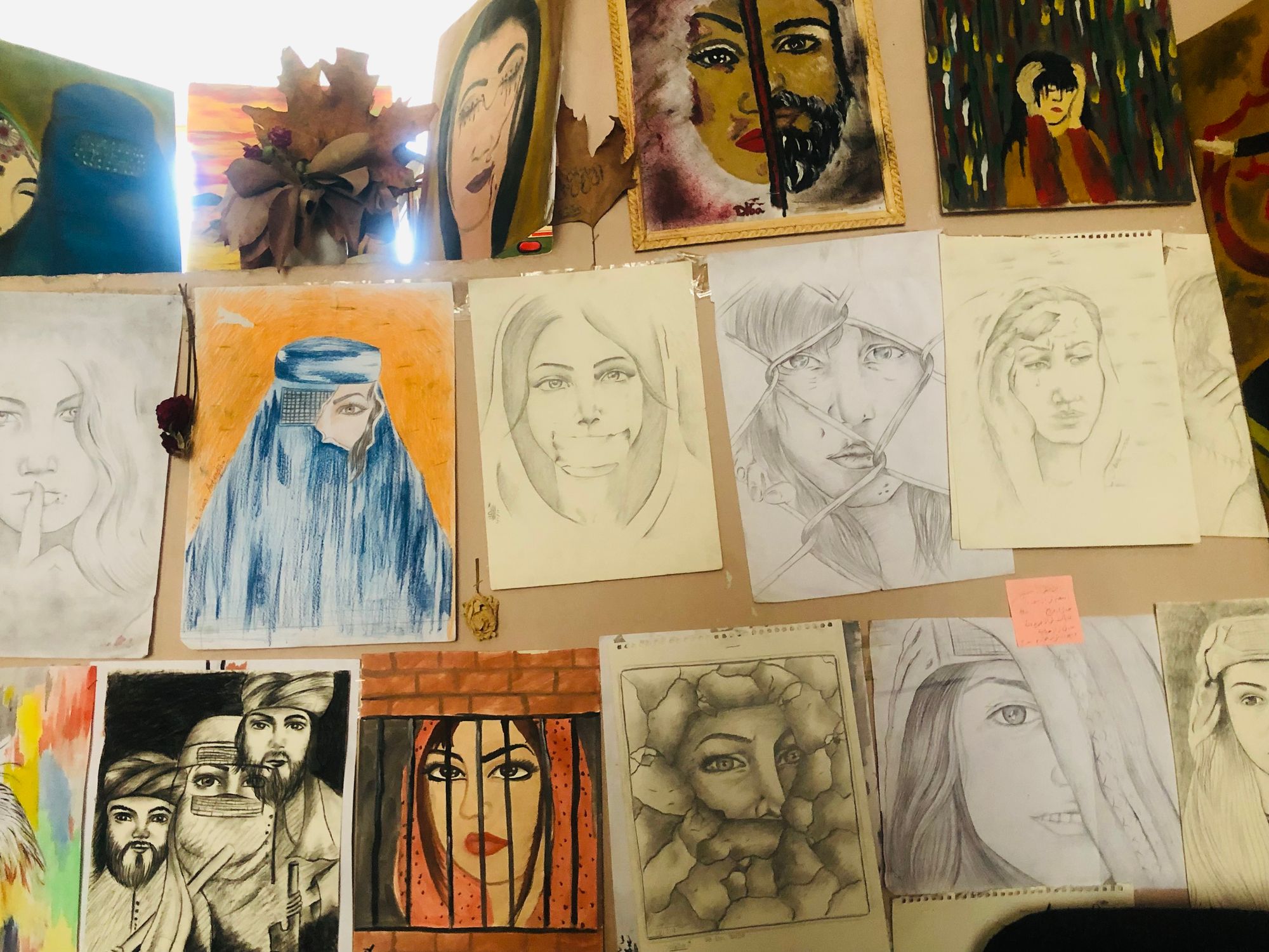 A black and white drawing of Reza Gul, an Afghan woman who had her nose cut off by her husband in 2016, hangs on the wall, next to a painting of a woman in a pink scarf who is being silenced by a hand covering her mouth.