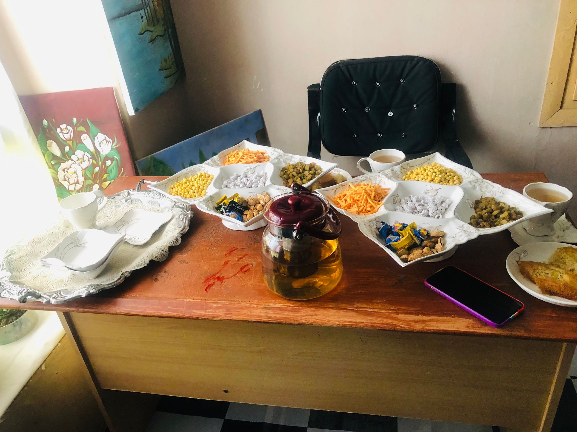 At 11 in the morning, Diba brings a large tray full of dried nuts and fruits, a tasty cake, and green tea. Hospitality is the most beautiful custom among Afghans across the country, something you will experience wherever you go.