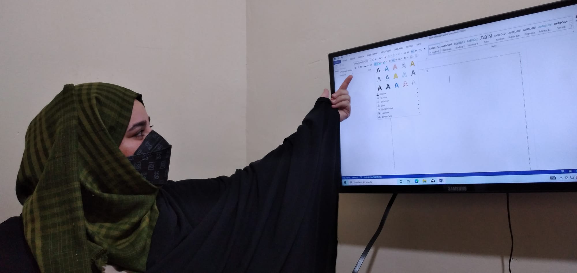 Wearing a full head-to-toe black hijab, with her mouth covered by a black mask with dark gray floral pattern, following the Taliban’s dress code, Homa teaches an English class at Parwaz, a woman-only education center.