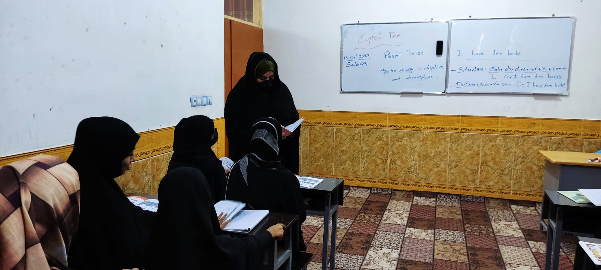 Homa spent around 150,000 Afghanis ($2,071) on equipment and leasing space for the center, the majority of which she borrowed from friends. The building is like many Afghan buildings, mostly white, with patterned dark yellow and brown marbling. Each classroom is adorned with a whiteboard. A standalone cabinet with a glass front showcases a few rows of books, several copies of the holy Quran among them.