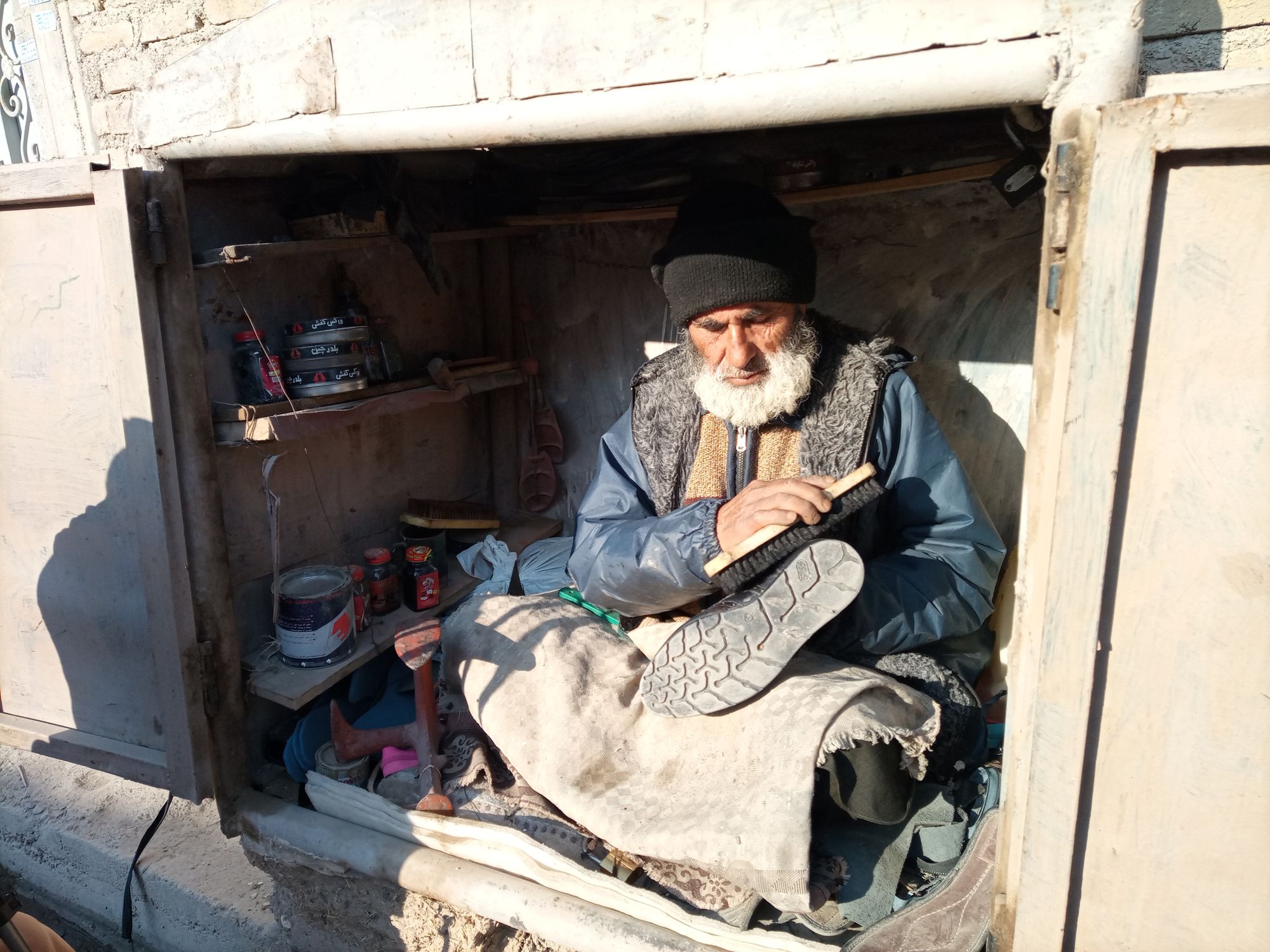 We are slowly arriving at his workplace, a booth made of cement, with a wooden door set up along a sidewalk that he has to sit in to be able to fit. The shoe cobbler started working after opening up his booth.
