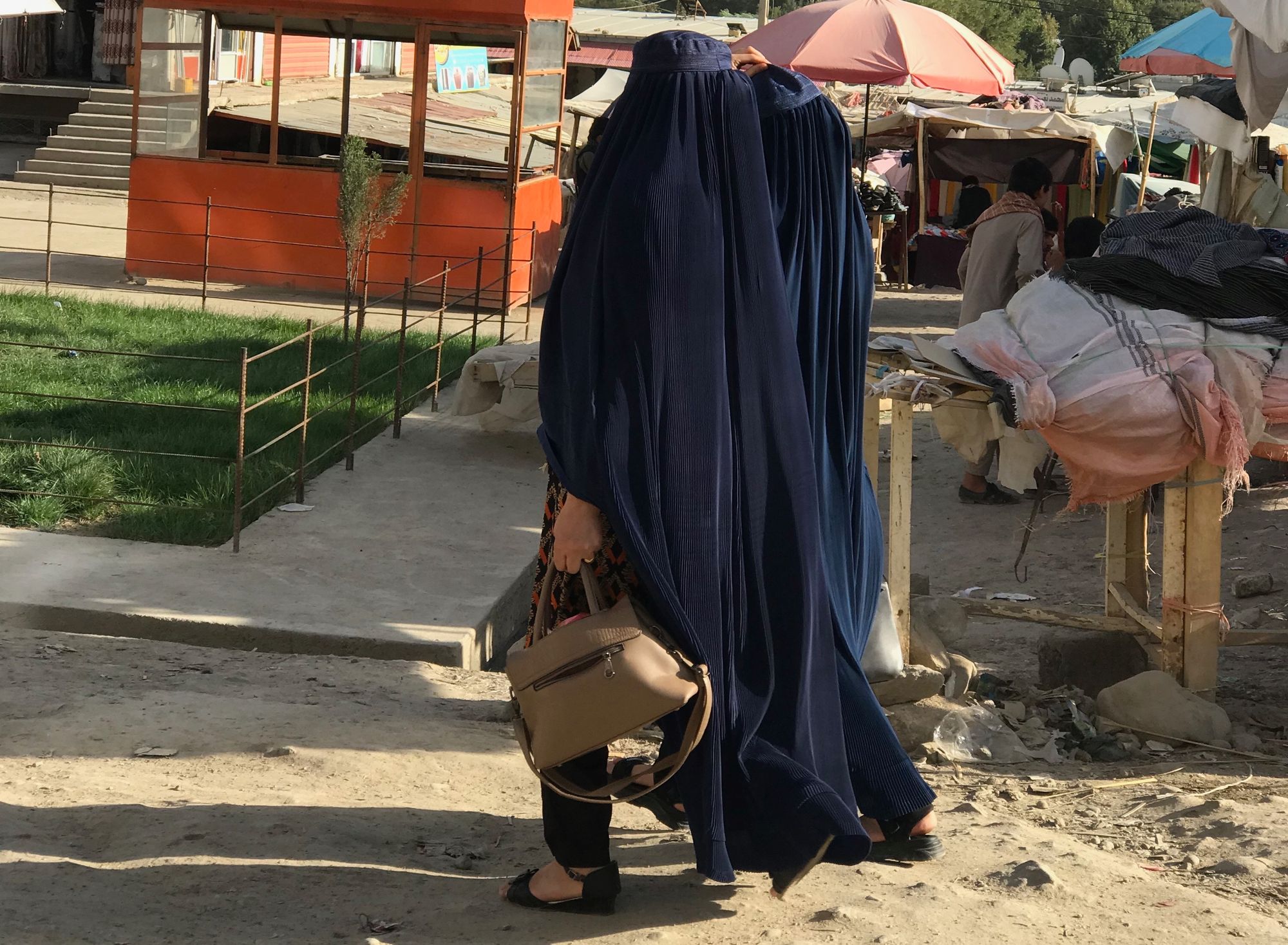 Although she is technically covered from head to toe, her outfit still does not conform with the new standards the Taliban has set for women in public spaces.
